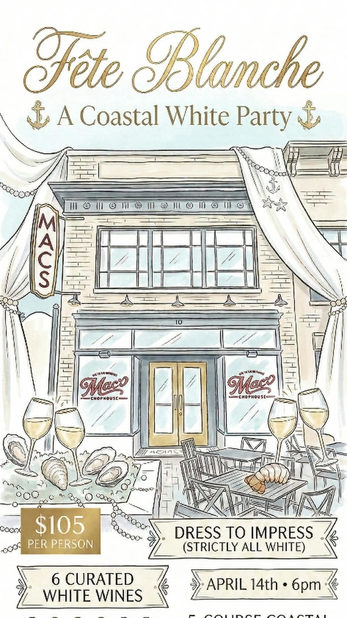 Location: Mac’s Chophouse Style: Coastal Chic | All-White Attire Required. Space is limited for this exclusive wine event.